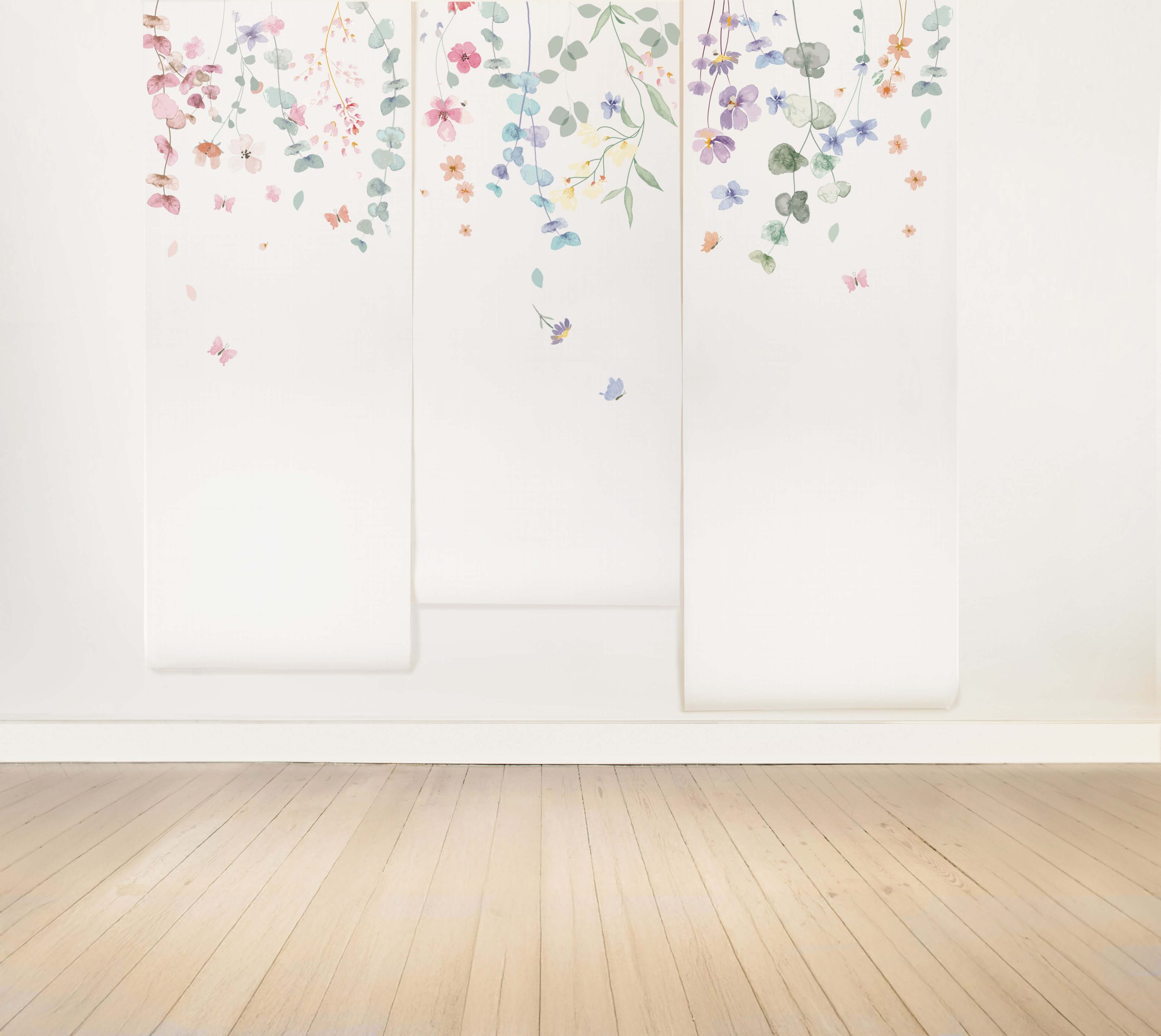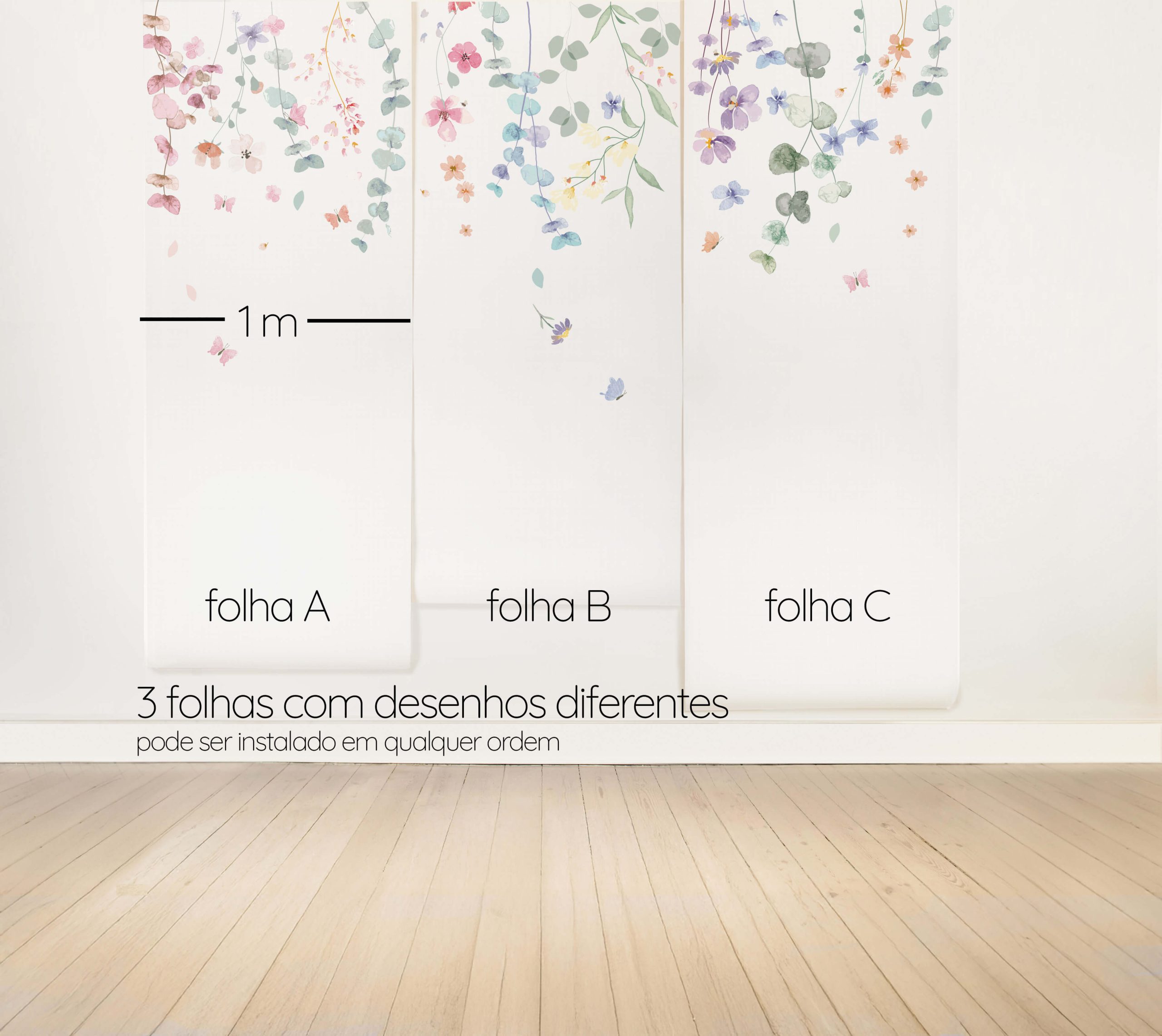 O Papel de Parede Jardim Suspenso Aquarelado traz a delicadeza da arte botânica para o seu ambiente, com flores etéreas que parecem flutuar em uma composição leve e serena. Composto por três folhas com desenhos distintos, a ordem de instalação pode ser alterada. No site, a compra segue a sequência A/B/C, repetindo-se automaticamente conforme a quantidade solicitada. Entre em contato para produzirmos este modelo sob medida para o seu espaço e alinharmos as cores à sua paleta exclusiva.