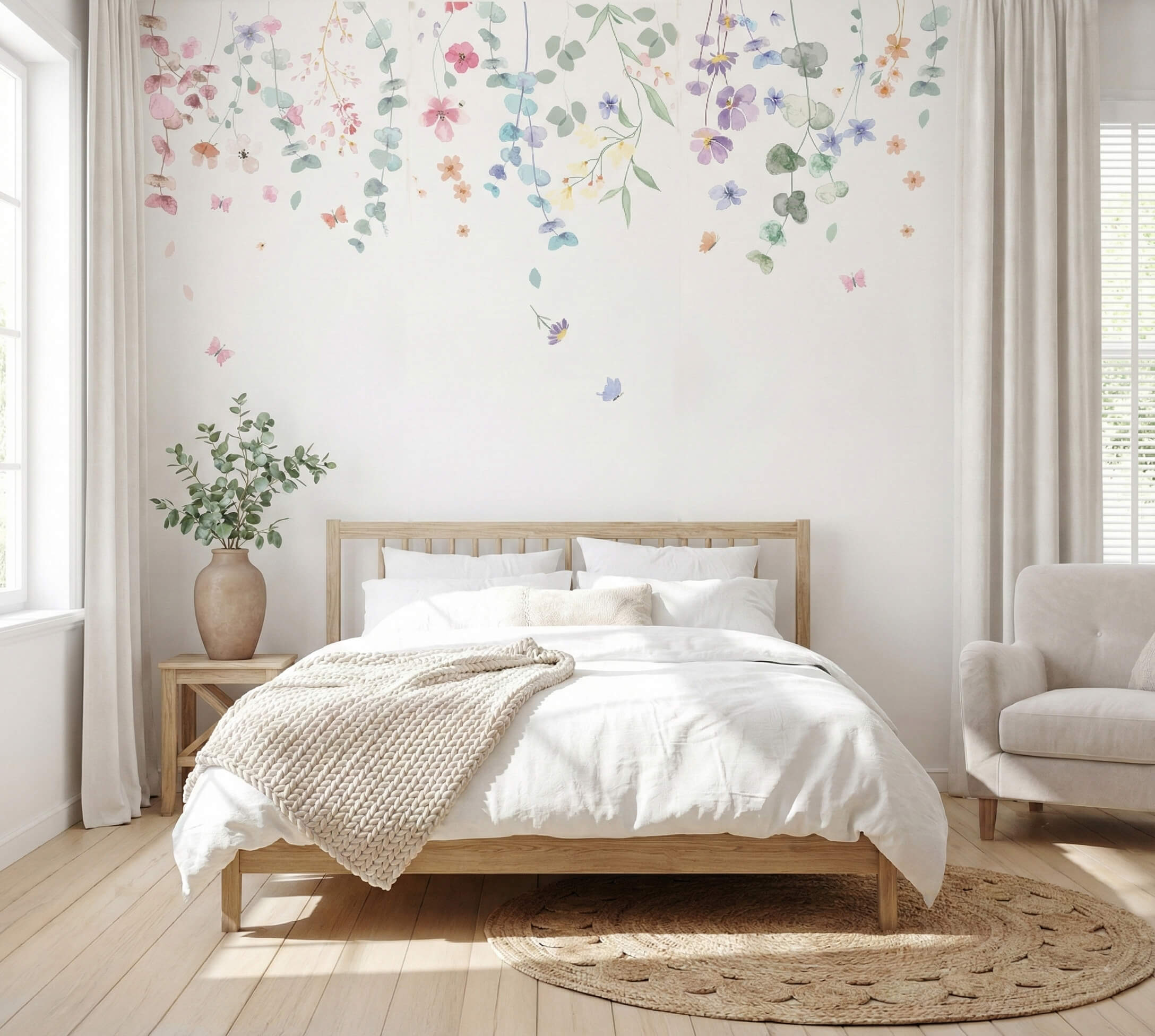 O Jardim Suspenso Aquarelado é a escolha perfeita para criar um refúgio de serenidade e frescor em ambientes internos. No dormitório, suas flores etéreas trazem uma atmosfera onírica e relaxante para a parede principal. Em salas de estar, ele funciona como um jardim vertical artístico que amplia visualmente o espaço. Sua estética fluida também é ideal para quartos infantis e espaços de autocuidado, onde a delicadeza do traço aquarelado promove bem-estar. Entre em contato para produzirmos este modelo sob medida para o seu espaço e personalizarmos as cores de acordo com a sua paleta exclusiva.