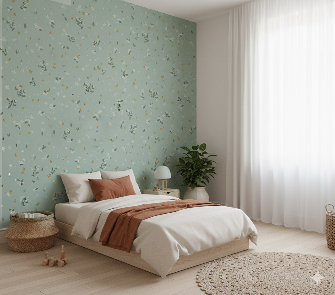 O Papel de Parede Laranjeira é ideal para ambientes que pedem uma atmosfera leve, fresca e relaxante. No quarto de bebês ou crianças, ele funciona como um cenário lúdico e delicado, estimulando a calma através de suas cores suaves e elementos botânicos.
