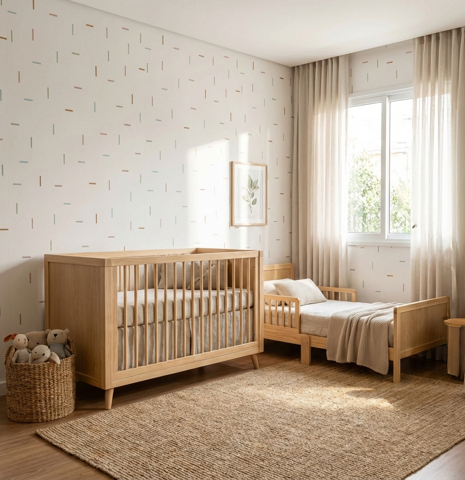 Quartos Infantis e de Bebê: Por ter uma paleta delicada e um padrão unissex, é perfeito para criar um ambiente calmo e atemporal que acompanha o crescimento da criança.